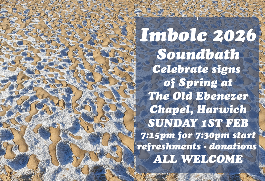 Imbolc marks the First Quarter of the year between the Winter Solstice and the Spring Equinox. It occurs in the depth of winter and signals the start of the transition to Spring. Come and enjoy this wonderful moment in the year together at the Old Ebenezer Chapel Harwich and experience the calming effects of a Sound Bath Meditation performed by Ruth and Jim. Refreshments afterwards. Donations welcome.